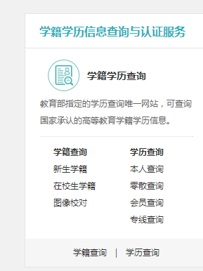 查询方法:www.chsi.com.cn→“学籍学历信息查询与认证服务”→“学籍查询”→“新生学籍”,进行实名注册后方可查询本人学籍信息(注:一个身份证号码只能注册一次,在实名制注册的时候,请记住账号,最好是常用的QQ邮箱、密码)。在绑定实名制的时候,如出现收不到验证码或者验证码无效的情况,请耐心多试几次。